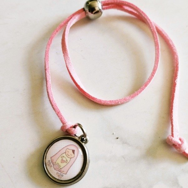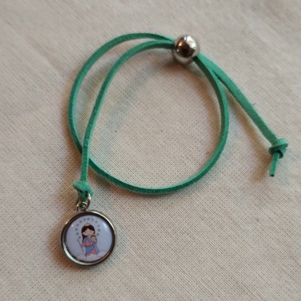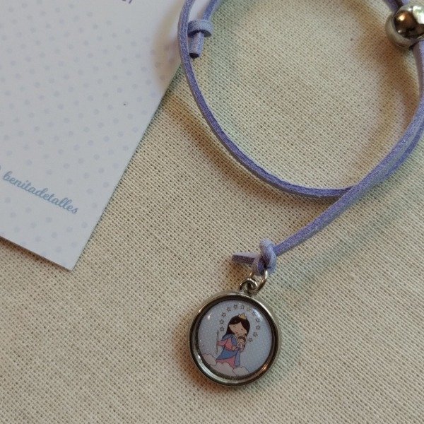 • Pulsera Tiento de gamuza con medallita de 15mm, resinada con acabado brillante y duradero. Imagen y color gamuza a elección según nuestros catálogos.