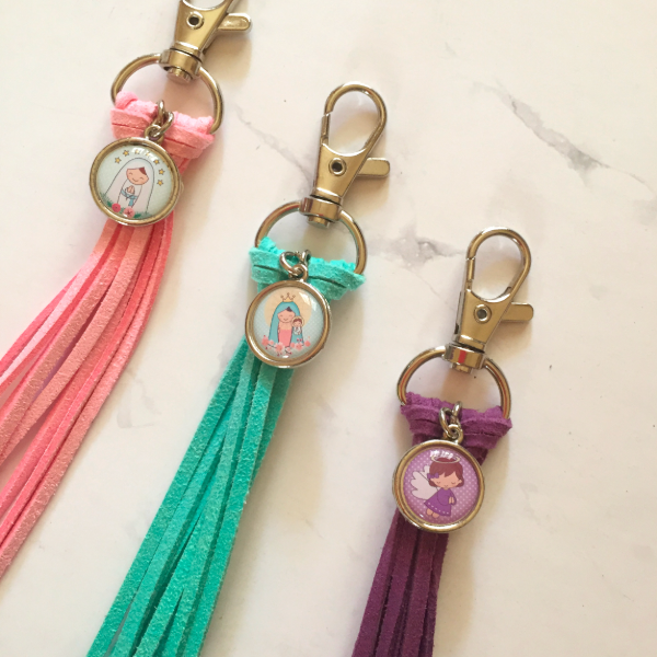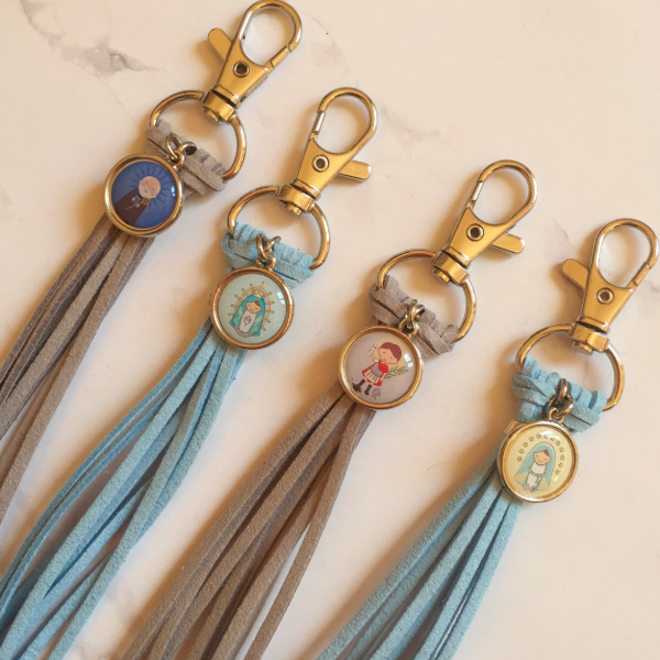 Souvenir Llavero gamuza con medallita en bolsa individual con tarjetita de recuerdo según celebración.