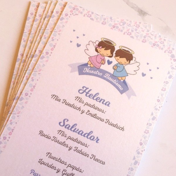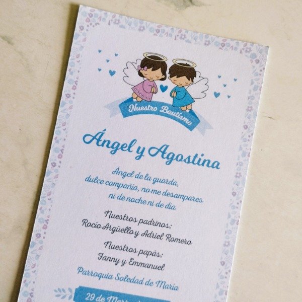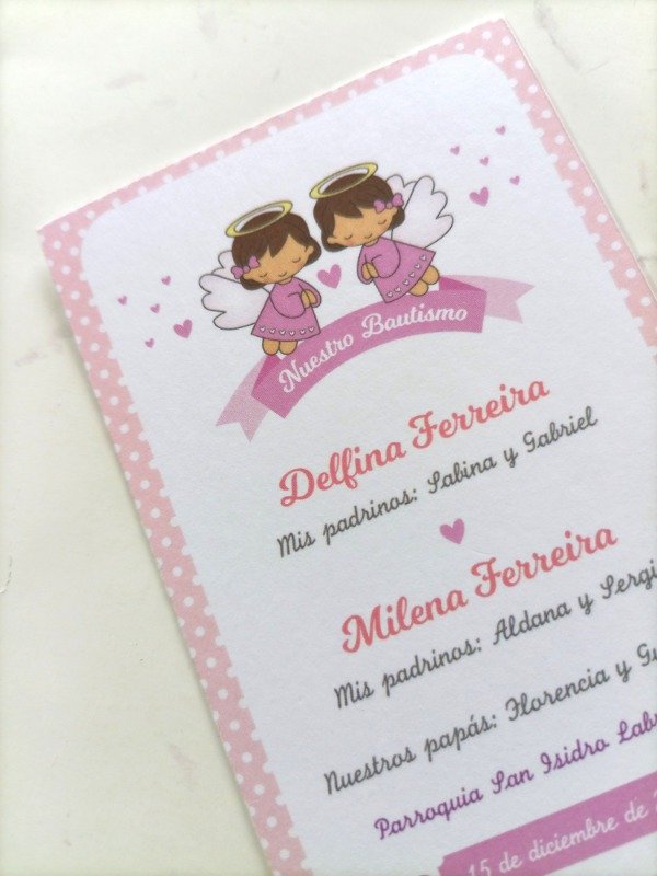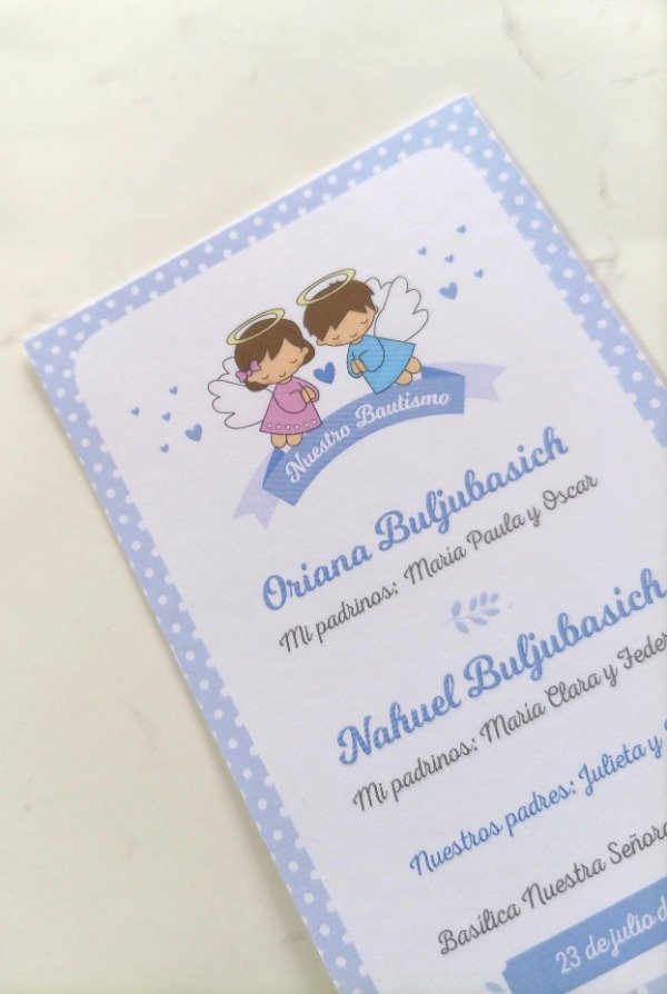Se personaliza con nombre de cada bebé con sus respectivos padrinos, el nombre de la Iglesia y fecha.
