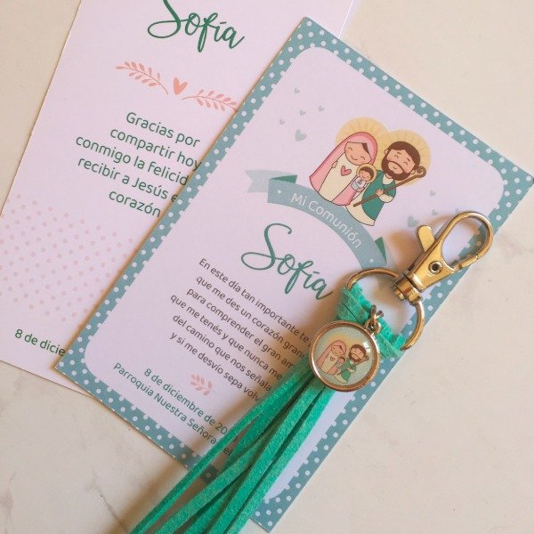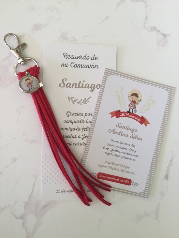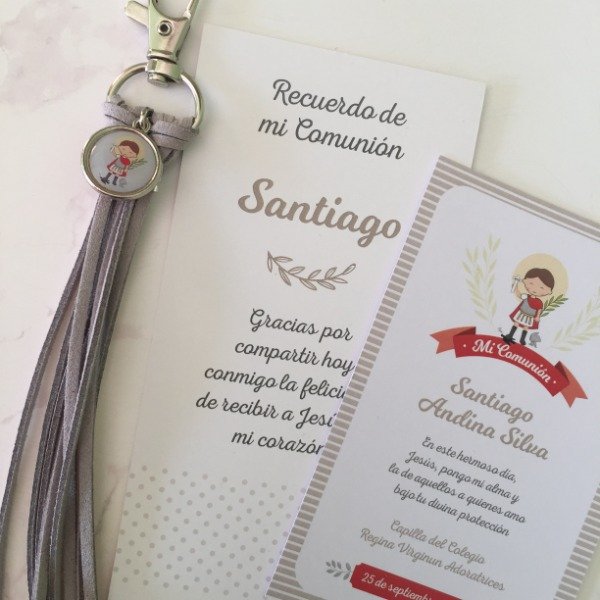 Souvenir Llavero gamuza con medallita en bolsa individual con tarjetita de recuerdo según celebración.